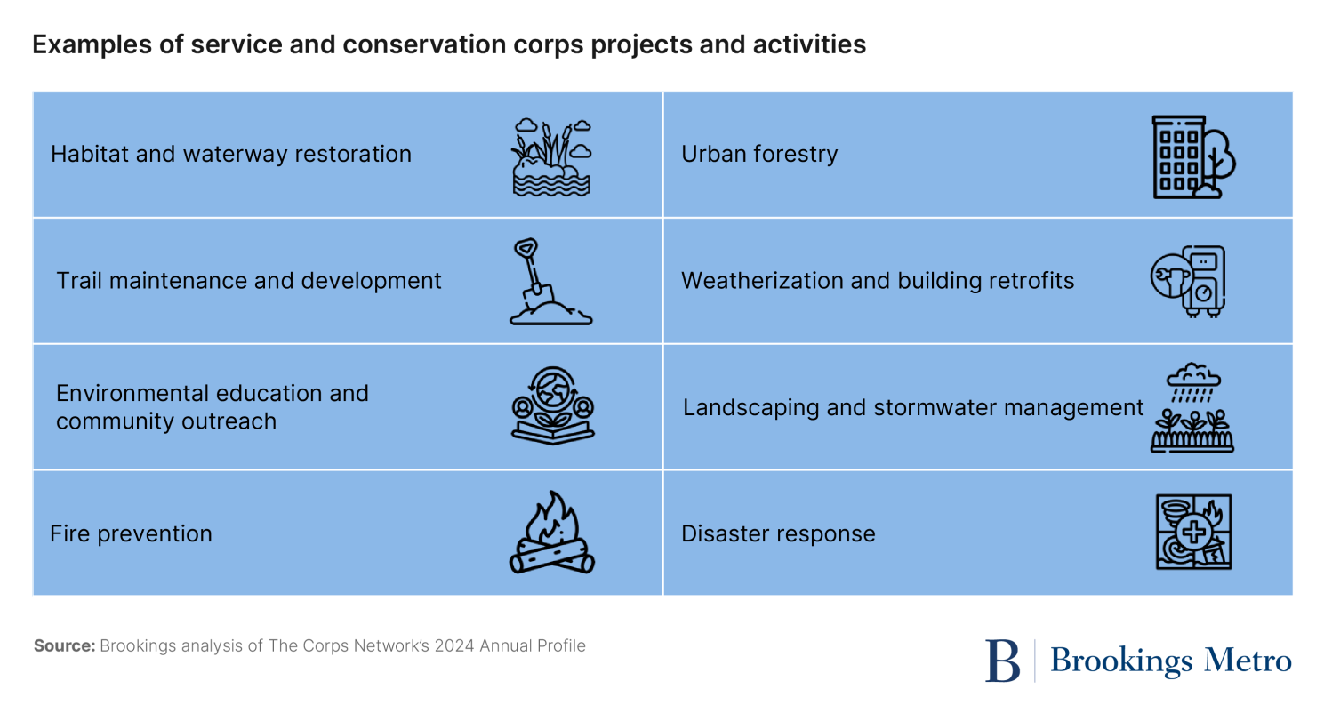- As a starting point, we created a broad list building off previous Brookings research on infrastructure occupations that closely align with several corps-related activities.