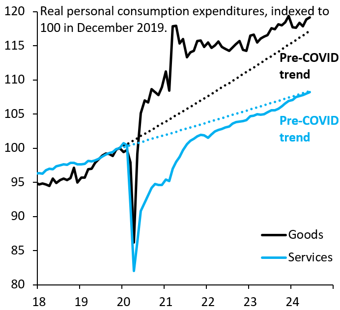 The pandemic made social distancing necessary, requiring large parts of the economy to be shut down. As a result, the fall in economic activity was deeper and more abrupt than during the Great Recession, raising the possibility that lasting damage—in the form of persistent output gaps—could result. Policy stimulus was therefore aggressive and—given the subsequent rise in inflation—there is now understandable debate whether this was excessive. We examine this issue using new data on supply chain disruptions, most notably on how firms raised margins at the height of COVID-19. But before we turn to margins, it is worth noting that the case for overheating in the data is not strong. While GDP has largely recovered, it remains below its pre-COVID trend, a point against overheating (Figure 1). Moreover, while goods consumption rose sharply during COVID-19, services consumption suffered steep declines and is only now nearing its pre-COVID trend (Figure 2).