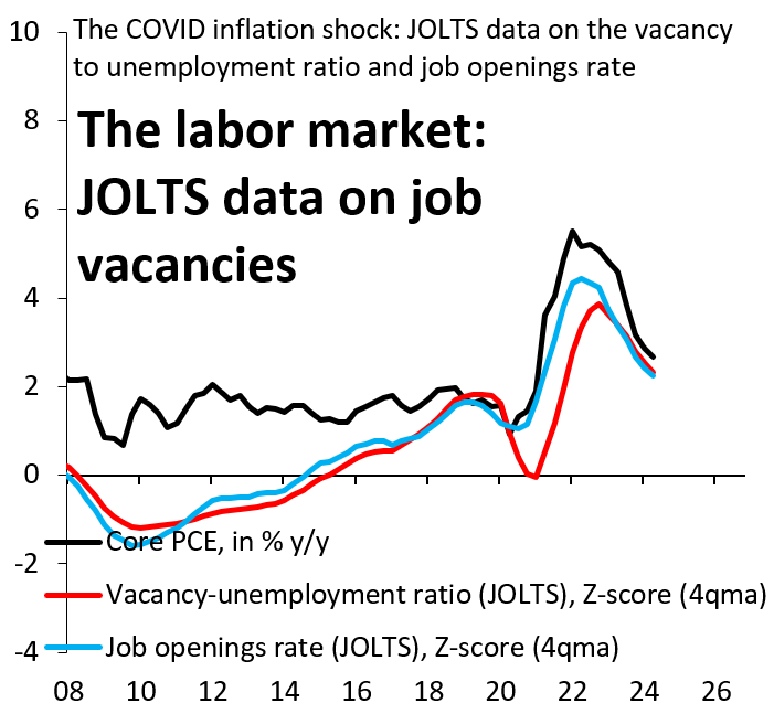 Figure 7 breaks down the drivers of core PCE inflation in our baseline model, which uses only delivery times as a proxy for supply chain disruptions. Figure 8 shows the same thing for our augmented model where—in addition to delivery times—we also use margins and new orders minus inventories to proxy for supply chain problems. In both cases, the black line is year-over-year core PCE inflation, where we have subtracted the constant in our regression and the contribution from 10-year inflation expectations. The bars show the contributions from various drivers. Three conclusions emerge. First, regardless of which model we use, supply disruptions explain the bulk of COVID-era inflation. Using delivery times only, supply chains explain 58% of year-over-year inflation in Q4 2021, while in the case of our expanded list of supply chain variables this number grows to 79% (these shares are 25% and 62%, respectively, in Q4 2022). Second, margins are by far the most important supply chain variable and crowd out any role for the vacancies-to-unemployment measure. The share of Q4 2021 inflation accounted for by delivery times goes from 58% in our simple model to 24% when we include margins. Labor market tightness—and thus excessive policy stimulus—look to have played a minor role. Third, margins lag the normalization in delivery times substantially. Indeed, this lag is so important that the overall supply chain effect in Q4 2023 in our expanded model is positive at 13%, while this number is -27%in the delivery times only model. Indeed, margins are only about to go negative in the latest data, which means this may be an important source of disinflation going forward.