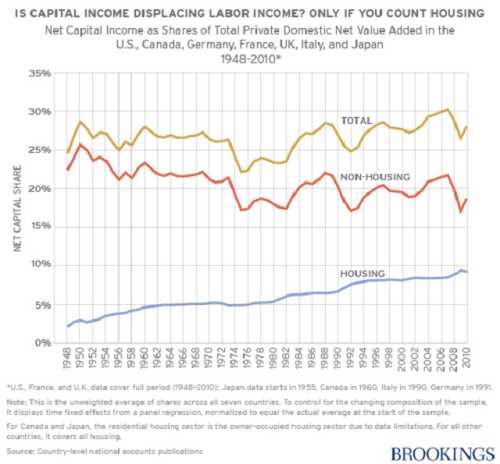 Existing studies that show an increase in capital’s share of income miss the growing role of depreciation in short-lived capital, in items such as software, says MIT’s Matthew Rognlie in “Deciphering the Fall and Rise in the Net Capital Share.” Rognlie subtracts depreciation in seven large developed economies (the United States, Japan, Germany, France, the UK, Italy, and Canada) to get net capital income, and finds that the only long-term rise in capital’s share of income is in housing. Capital income elsewhere in the economy has grown moderately, but it is only recovering from a large fall that lasted from 1948 through the 1970s.