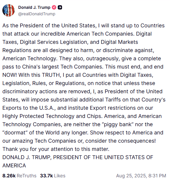 Despite these parallels—and decades of mutually beneficial trade—Donald Trump is demanding the EU to “Show respect to America and our amazing Tech Companies” and to “end, and end NOW!” its digital market regulations. It is a 21st-century reprise of mercantilism, with the government as the enforcer on behalf of its most powerful corporations.