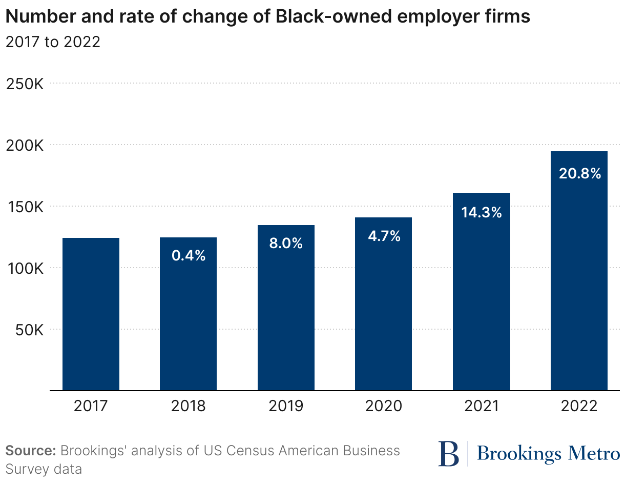 Black-owned employer businesses (firms with at least one employee) made up a large share of this growth. From 2017 to 2022, the number of employer businesses owned by Black Americans increased by 56.9%. Of the roughly 132,000 new employer businesses started in the U.S. between those years, at least 70,000—over half—were Black-owned.
