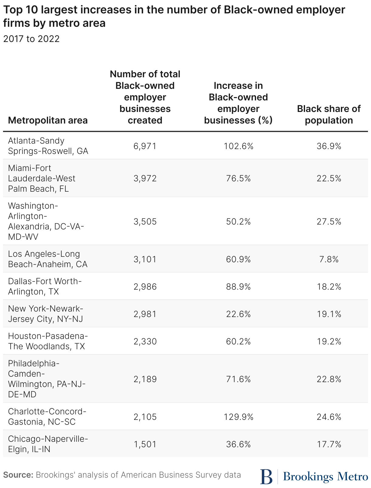 • Black-owned employer businesses are flourishing in the South and East, and many metro areas saw the number of Black-owned businesses more than double from 2017 to 2022, including Reno, Nev.; Minneapolis-Saint Paul-Bloomington, Minn.-Wis.; and Austin-Round Rock-San Marcos, Texas.