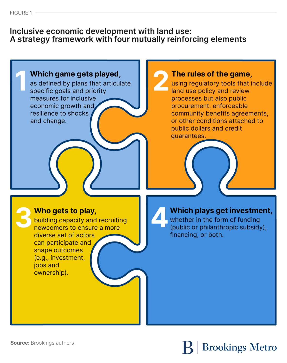 An action framework for more inclusive and equitable local economic development, including land use. The larger opportunity, and greater leverage, is integrating both goals and specific strategies that require mobilizing tools beyond land use regulation and innovative real estate development models (see Figure 1). We think of interlocking, mutually reinforcing strategies as aiming to affect four things that local governments and other governments can shape, even as technology and other macro forces shift specific opportunities and risks: