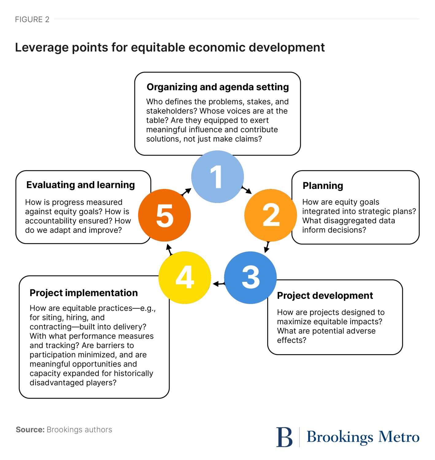 “Who decides” is the second part of this question. Who gets to benefit from economic development is shaped in part by who gets to influence and make significant decisions about it. Key decisions happen at more than one stage or level of granularity. For example, broad directional choices matter for a community or region in one set of ways and project-shaping choices in another, but both matter. We think of the leverage points for advancing more equitable economic development in terms of the stakes that present at distinct stages of defining, strategizing, and implementing local change agendas—which often engage state and federal players too—and then learning from them, to reinforce effort and make it more adaptive and accountable over time (see Figure 2).