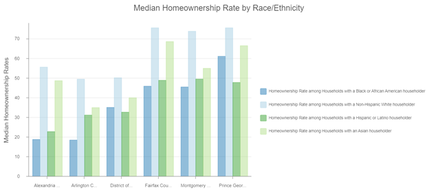 Because wealth in the United States is heavily determined by homeownership and income, we provide some additional geographical analyses. Within the five counties and Washington, D.C. we reviewed, there are large negative racial disparities in income and homeownership. Black and Hispanic/Latino residents experience the greatest negative disparities in the two wealth measures we analyzed.