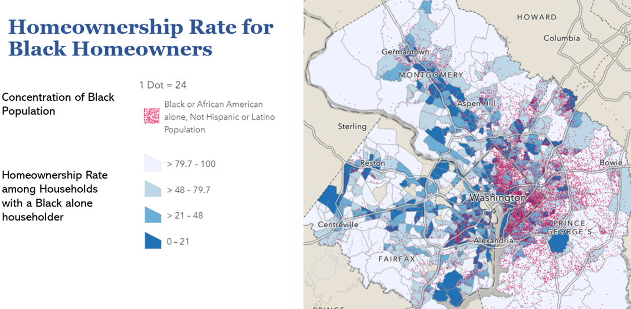 We used income and homeownership data from the American Community Survey (ACS) 5-Year Census to identify groups of census tracts where people of color had the lowest income in the region. We did an additional overlay to name places in the D.C. region where homeownership rates among Blacks and Latinos remain the lowest. Through a visual analysis of these trends in location, we found “hotspot”[i] areas suffering disproportionately from the persistent racial homeownership gap.