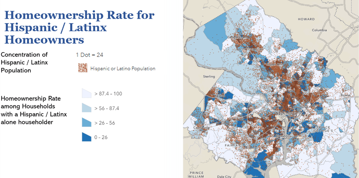 Black people consistently have the lowest homeownership rates of any race or ethnicity in the region. However, on average across the region, about 20% of homeowners in each county identify as either Hispanic, Asian and American Indian, with Hispanics making up the largest portion of this group. In Montgomery County, Fairfax County, and Prince George’s County, the census tracts with the highest concentrations of Hispanic/Latinos display homeownership rates under 23%.