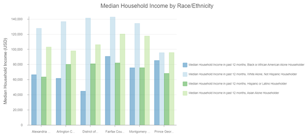 It is well-known that throughout cities in the United States, there is a significant set of economic disparities between white people and people of color. In this blog, we explored the current contours of economic opportunity in the five counties (Prince George’s, Montgomery, Arlington, Alexandria, Fairfax) and Washington, D.C. that make up the D.C. metropolitan area better known as the DMV.