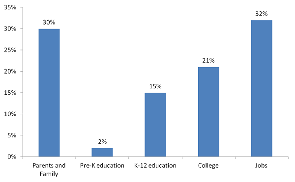 Taken together, the three educational elements (pre-k, K-12 and college) attracted 38% support. Broadly, then, U.S. citizens rank education, jobs, and family as about equally important in terms of promoting a more socially mobile society.
