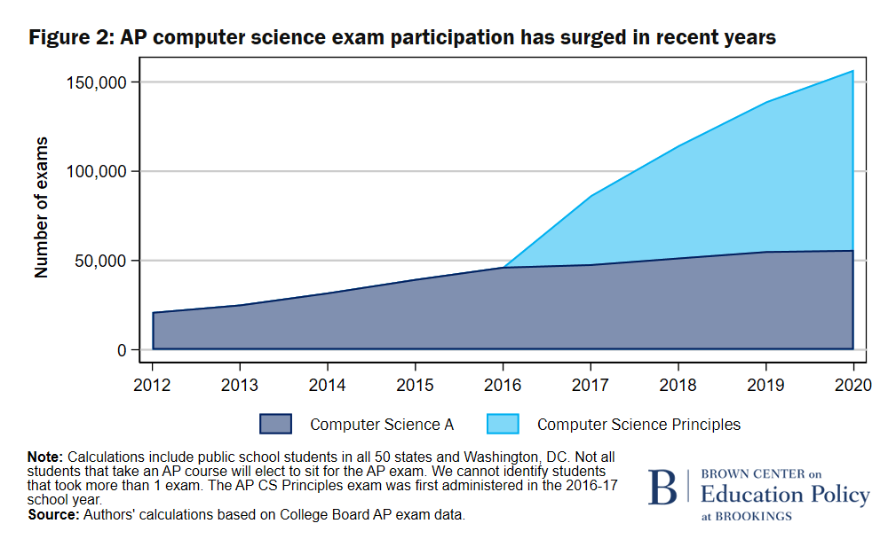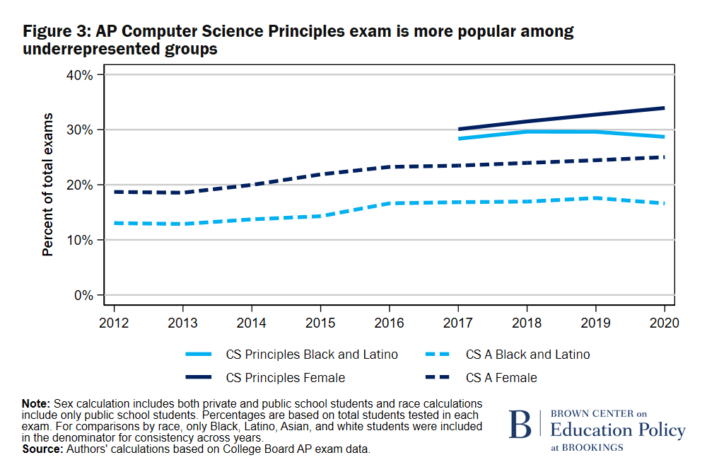 During the years of our investigation, the College Board administered two AP exams covering CS content: Computer Science A (AP CS A) and Computer Science Principles (AP CS P). AP CS A is intended to cover material expected of a first-year CS course in college (with a heavy emphasis on coding), while AP CS P is expected to cover a first-year computing course (including more foundational content such as technology’s impacts on society and understanding how algorithms and networks function). Students in both courses will learn to design a computer program, but only students taking AP CS A will develop the algorithms and code needed for implementation. This does not necessarily mean that AP CS A is more effective—though it is more rigorous and would come after AP CS P in a course sequence. A recent College Board report concludes that students who take AP CS P (relative to those not given the chance) are more likely to take AP CS A in later high school years or declare a CS college major. Though not causal, these findings underscore the importance of AP CS P in developing student interest in the field, particularly among underrepresented student groups.
