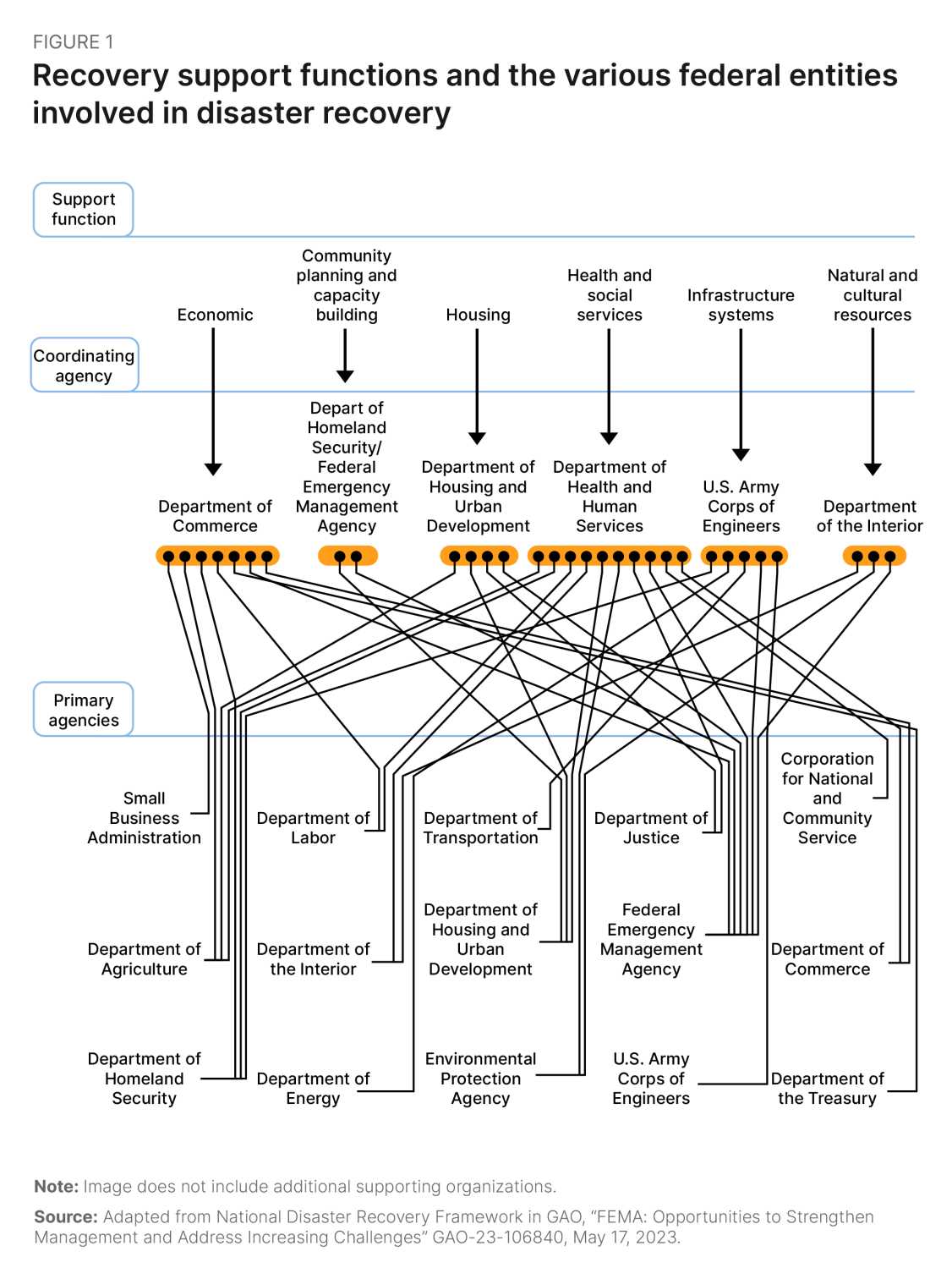 The current federal disaster management structure is labyrinthian: Five “mission area frameworks” spread across 32 “core capabilities” that involve dozens of federal programs in multiple cabinet and non-cabinet agencies, each with its own support function and coordinating role.