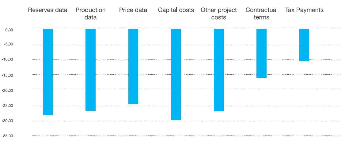 The creation and use of an effective model requires robust and accurate data in order to yield reliable estimates; however, this data is often difficult to obtain. In order to assess the importance of different data points in creating these financial models, the AfDB and OpenOil’s survey with government officials asked about the difficulty of accessing data (Figure 1). According to the respondents, access to information on costs (including capital costs) seems to be the hardest to obtain, though access to other data points overall is quite low. The report attributes the large gap to poor geological information and the public sector’s low ability to monitor extractive operations.