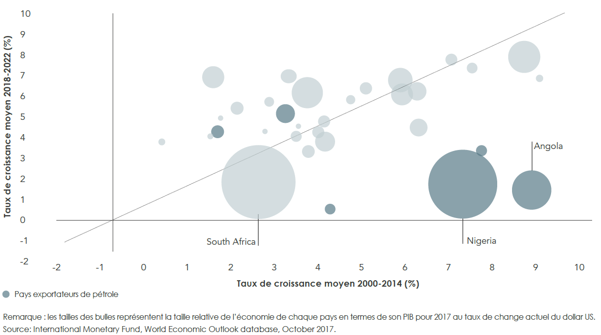 Ce cadre global masque de nettes différences entre les différents pays. Il est important de préciser que la reprise restera tiède dans les plus grandes économies du continent, l’Angola, le Nigeria et l’Afrique du Sud,1 où la croissance atteindra en moyenne deux pourcent au cours des cinq années à venir, soit un taux inférieur au taux de croissance démographique. Ces grandes économies risquent de clore une décennie en perte si les responsables politiques ne se décident pas à mettre en œuvre d’importantes réformes afin de libérer le modèle de croissance de sa dépendance excessive envers le pétrole en Angola et au Nigeria et, dans le cas de l’Afrique du Sud, afin de surmonter les problèmes structurels, hérités pour beaucoup de l’époque de l’apartheid.