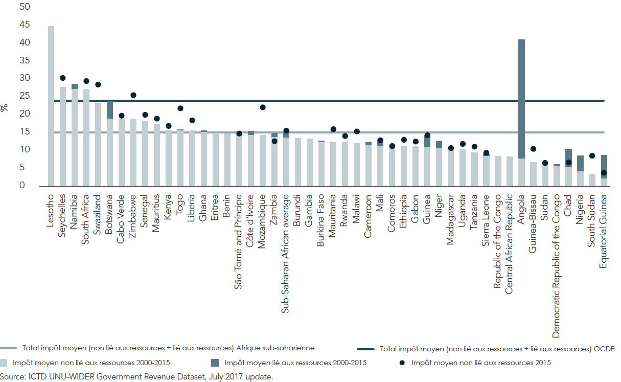 En premier lieu, les recettes fiscales sont faibles. Cette situation reflète non seulement la taille de l’économie informelle mais aussi les inefficiences en matière de recouvrement fiscal. Les recettes fiscales moyennes (hors cotisations sociales) se situent à environ 15 pourcent en Afrique sub-saharienne, contre 24 pourcent dans les pays de l’OCDE (Figure 2.4). Pour un certain nombre d’économies, les recettes représentent moins de 10 pourcent du PIB. La grande faiblesse des recettes fiscales de certaines économies à forte intensité de ressources suggère qu’il est possible de mobiliser davantage de recettes auprès des secteurs à faible intensité de ressources. À titre d’exemple, les recettes tirées des secteurs à faible intensité de ressources de l’Angola, du Tchad et du Nigeria ne représentent que 5 pourcent du PIB. La dépendance excessive des recettes tirées des ressources exacerbe les effets de la chute des prix des matières premières sur ces économies. Par contraste, le Lesotho, la Namibie, les Seychelles, l’Afrique du Sud et le Swaziland ont eu de meilleurs résultats, en collectant des recettes comparables ou supérieures à la moyenne de l’OCDE. Les enseignements tirés de ces pays pourraient être utiles aux pays qui cherchent à encourager la mobilisation de recettes fiscales.