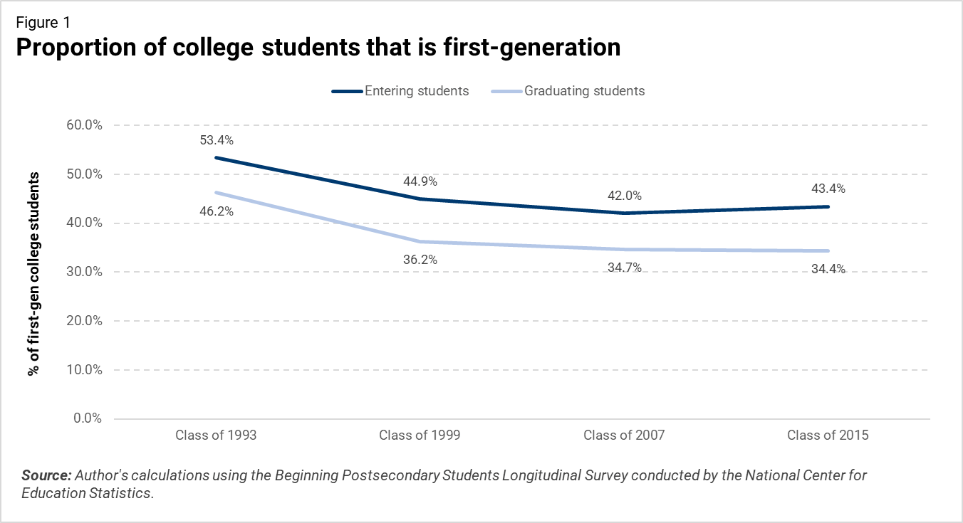 The first fact is that neither college-entering rates nor college-graduating rates for first-gen students have changed much in recent years (see Figure 1 below). But note that they decreased drastically in the ‘90s—partially due to the increased bachelor’s attainment rate in the U.S. in the ‘60s and ‘70s—leading to more college-goers having at least one college-educated parent. Today, over 40% of entering students are first-gen, as are about one-third of graduating students. (In Figure 1, the label “Class of 2015” means students who would have graduated in 2015 if they spent four years earning their bachelor’s. As is standard, the calculation of graduation rates allows up to six years for graduation.)