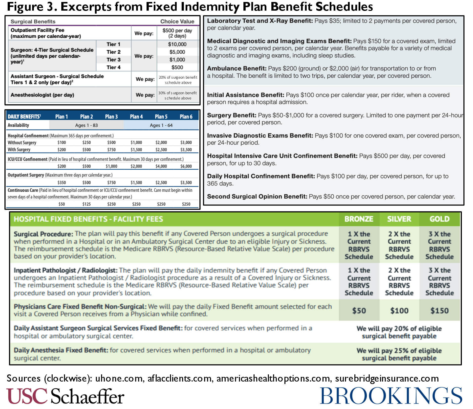 While this product is the most extreme example we encountered in our research, all fixed indemnity products we encountered vary payment amounts with the intensity of the medical care received to at least some degree. Payment for outpatient care is often highly variable, while payment for hospital services often varies along a smaller number of dimensions. For example, one plan pays an amount for hospitalization that varies only with whether or not the admission is for illness or injury, but outpatient services are paid as a multiple of the Medicare allowed amount for the actual care received. A large national carrier (that has a major online presence in many states) offers a multi-faceted reimbursement formula for surgeries: benefits are paid based on a four-tier schedule reflecting the complexity of the surgery plus separate amounts for anesthesiologists, assistant surgeons, and the outpatient facility fee. In this product, payment for a hospital admission does not vary based on the specific diagnosis, but does reflect characteristics of the care needed, such as whether it is in an ICU, what providers treat the patient on a given day, and whether the hospitalization is for illness or injury. Another carrier offers a fixed payment per day of “hospital confinement” but varying payments for short-stays in the hospital, emergency room visits, nursery stays for a newborn, “intensive” hospital diagnostic services, and the like. Many plans also allow consumers to select the level of reimbursement they would like to purchase ranging from, e.g., $100 to $3,000 per day of hospitalization – where the former reflects a product that might logically serve as income replacement while the latter is a benefit that is more likely to be conceived as payment for medical expenses. Figure 3 displays excerpts from some of these plan materials.