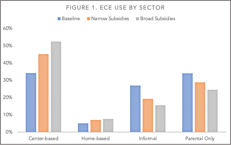 We explore a broad set of outcomes: (1) ECE participation by type of setting; (2) costs to households; (3) total costs of care; (4) mothers’ employment; and (5) ECE teacher wages.[3] The sections below describe our findings for each outcome. In each case, we compare the effects of the two scenarios to a baseline using the 2019 tax and child-care policy environment.[4]