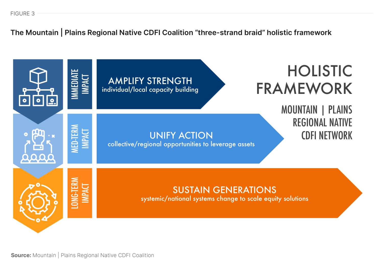 The experience of the Mountain | Plains Coalition offers specific instances of why representative leadership also matters for strategic efficacy. Investing in a Native-led coalition was fundamental because Native CDFIs had trust and relationships with borrowers, which meant they had a ready-made pipeline for deal flow. They could deliver better products and services to those borrowers, such as culturally competent, relationship-based, and trauma-informed lending. And because of their leadership, coalition members had a unique level of commitment to work through the hard issues of delivering those products and services in a challenging business environment, unlike any other market actor. It would have been nearly impossible for a national non-Native CDFI provider or a bank without these preexisting assets to successfully build an Indigenous finance cluster.