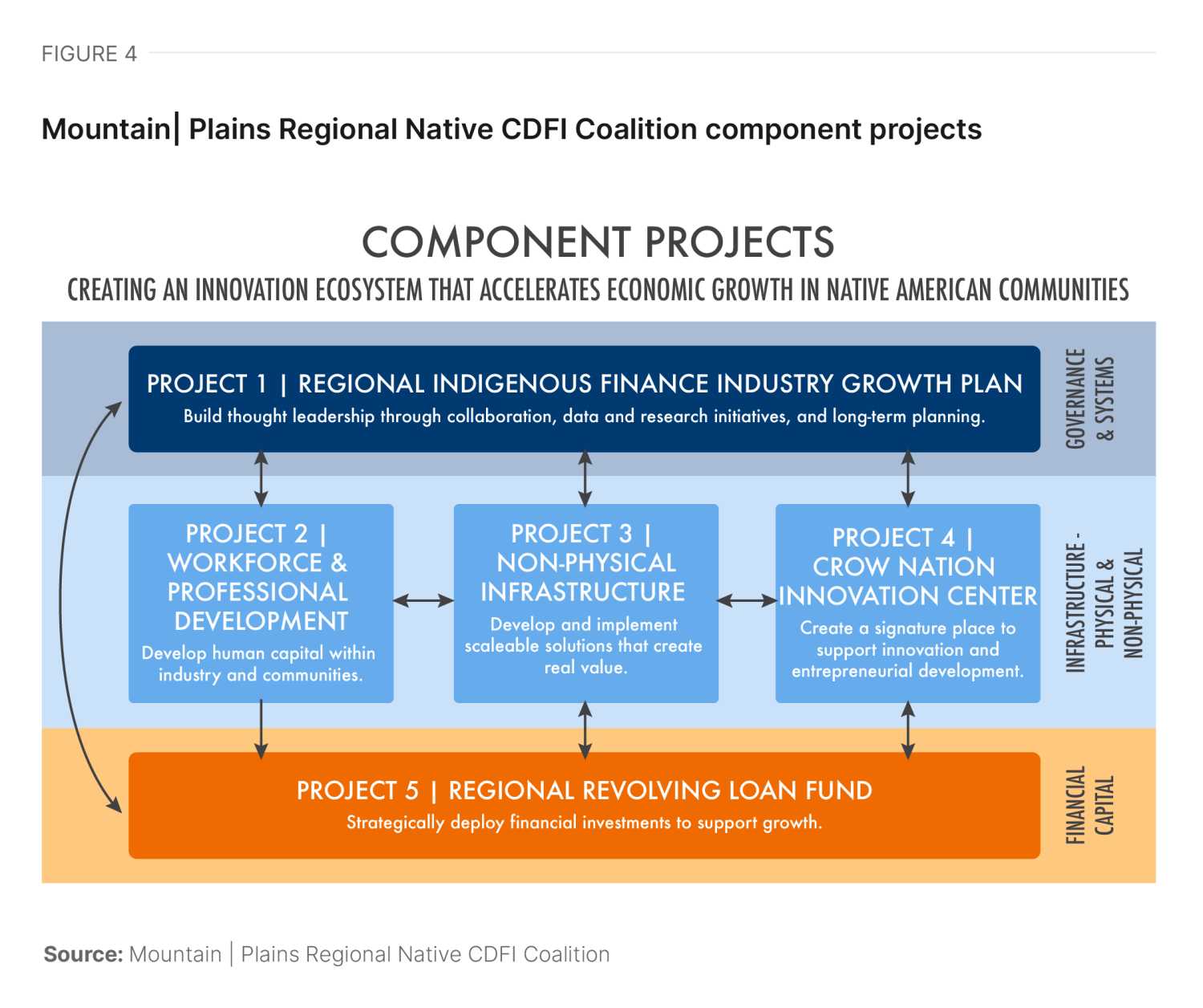 - Governance and systems: Native communities must navigate a complex set of rules and jurisdictional relationships between tribes, federal agencies, state governments, and local municipalities. Meanwhile, a lack of data prevents tribes and community members from gaining a solid understanding of their baseline economic realities. To develop governance and systems, the coalition proposed as its first project to create a Regional Indigenous Finance Industry Growth Plan to build thought leadership, collect data for the coalition to use, conduct relevant research initiatives, support long-term planning, and build new approaches to power sharing.