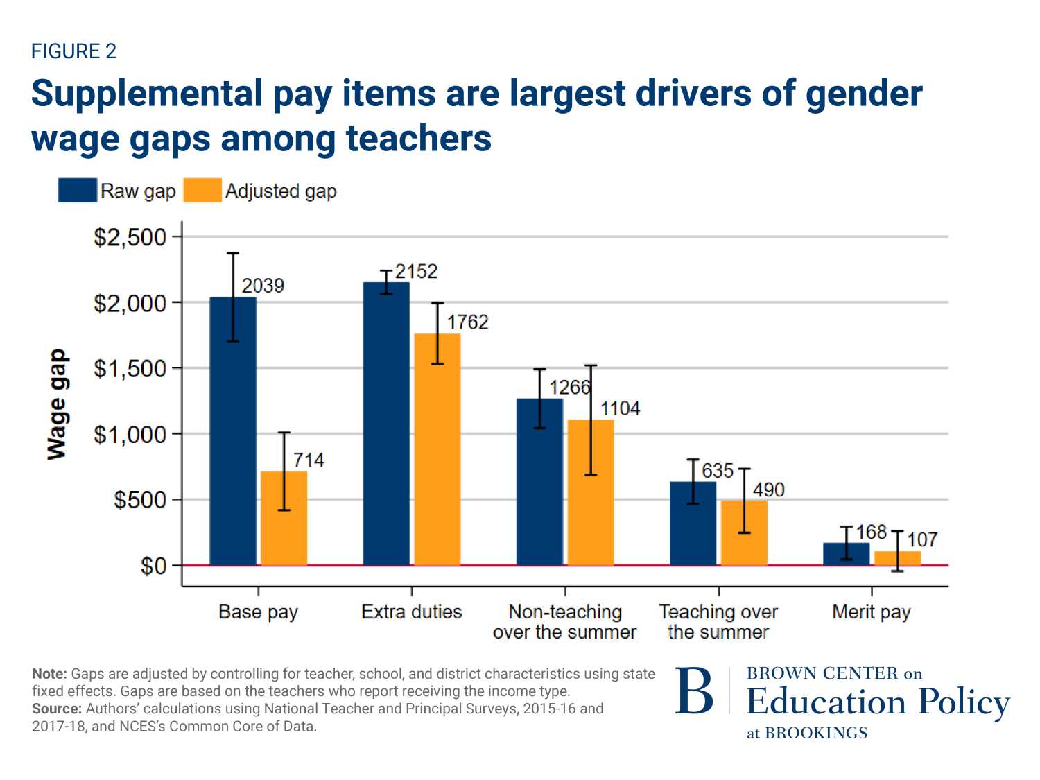 Our methodology is primarily descriptive. We calculate mean differences in men’s and women’s reported earnings, across school-based income sources reported in the surveys (inflation –adjusted to 2017 dollars). We analyze five distinct school-based income sources: base pay, summer school pay (teaching and non-teaching summer jobs separately), merit pay, and taking on extra duties (e.g., leading an extracurricular activity). Reported earnings from sources outside of school are not considered in our investigation, though prior work indicates such income can be important, especially for men. We then adjust teachers’ compensation by using regression models that control for teacher demographics, qualifications, assignments, school and district characteristics, and state fixed effects.1 Adjusted gaps reported in this brief represent the mean differences between men and women after applying these regression adjustments.