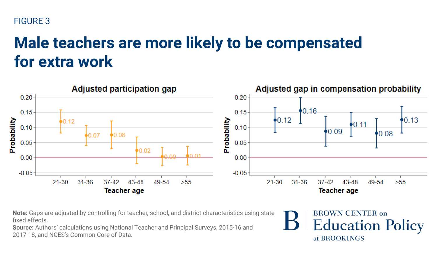 First, we look at participating in uncompensated extra work. One of the survey waves (the 2015-16 collection) gathered data on both those participating in extra duties beyond their base salary and those getting paid for them. Though most teachers (82%) report participating in these activities, less than half (44%) are paid specifically for the effort. As illustrated in Figure 3, men are both more likely to report participating in these tasks (on the left) and to report being paid for them, conditional on doing them (on the right). Notably, we estimate these differences at different teacher ages (along the x-axis of both panels) and find statistically significant gaps in participation during teachers’ 20s through early 40s. For example, male teachers are 12 percentage points more likely to participate in extra duties than their female peers when they are 21 to 30 years old, and seven percentage points more likely when they are 31 to 36 years old. This also happens to coincide with ages when women’s fertility peaks and they often have young children in the household. After having kids, women normally take on a larger share of household responsibilities than their male counterparts. Thus, we suspect caregiving activities are the most likely difference in explaining the gendered differential in labor supply we observe during these ages.