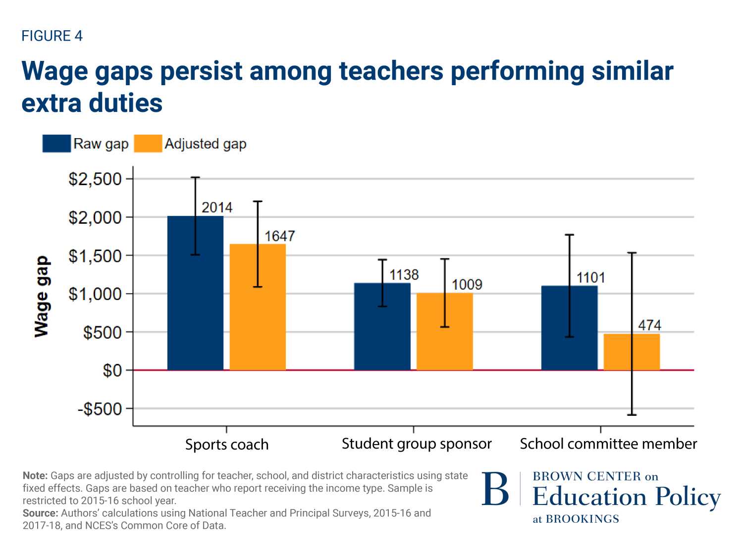 Overall, we find raw gender wage gaps of about $4,000 favoring men when combining all sources of teachers’ income from schools (using 2017 dollars). This means a 7% bonus paid to women only would be needed to fully equalize pay between genders, based on reported earnings in our sample. These gaps arise from differential compensation occurring both in base salary and in supplemental compensation teachers earn from schools.