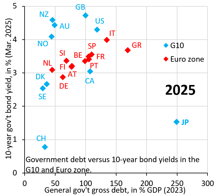 Figure 2. Government debt vs. 10-year bond yields in the G10 and eurozone