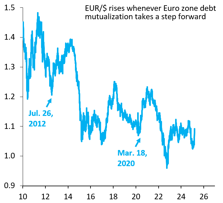 Figure 3. EUR/$ rises whenever eurozone debt mutualization takes a step forward