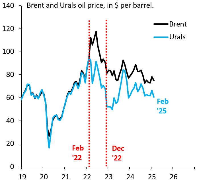 German politics are unsettled to put it mildly. Parties with pro-Russia leanings garnered close to 35% of the vote in the February election, up sharply from the previous vote in 2021. Given this trend, a medium-term rearmament program may not be much of a deterrent to Russia and does little to help Ukraine in the short term. A better approach—certainly a complementary one—would be to shut down Russia’s shadow fleet of oil tankers in the Baltic, the single biggest exit point for seaborne oil out of Russia. This could hurt materially Russia’s tax revenues from oil exports (Figure 5) by weighing on the price of Urals versus Brent, as was the case in December 2022 when the start of the G7 price cap impaired Russia’s access to global oil markets (Figure 6). Shutting down the shadow fleet could be done in short order and at very little cost. At the very least, this should be done in conjunction with Germany’s fiscal expansion, which is oriented more toward the medium term. This would be the best way to deter Russia and help Ukraine.