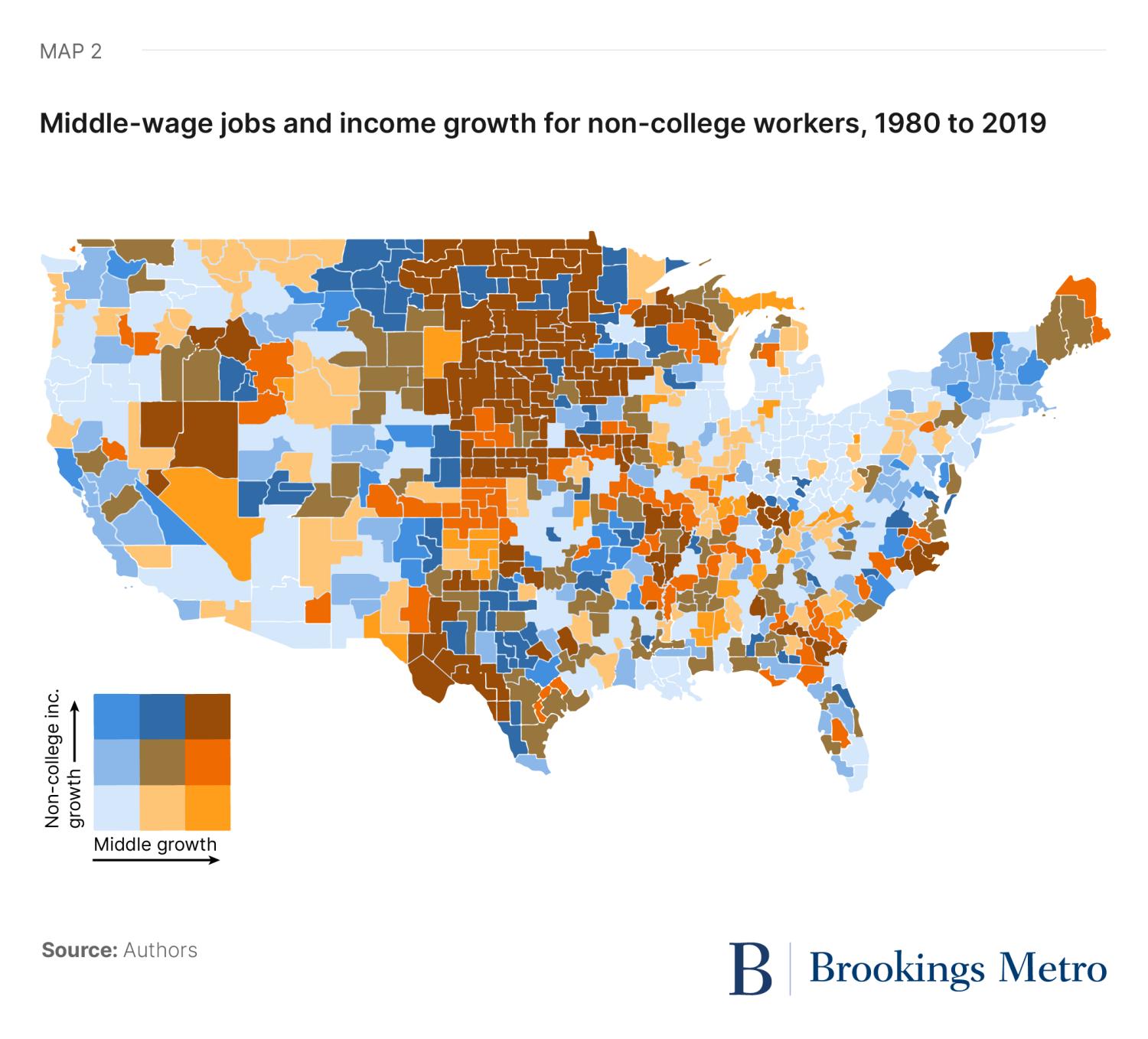 But places with middle-wage job growth have been associated with higher upward mobility— defined as the expected economic outcome for a child born into a lower-income family—as well as higher income growth for workers without a college degree. And when we mapped regions’ growth in middle-wage jobs as well as their growth in non-college income growth, we found the same central corridor regions experiencing the highest growth in their share of middle-wage jobs and the highest growth in incomes for those without a college degree (see Map 2). Although we can’t determine from the data whether these factors are causally linked, the positive association suggests that growing middle-wage jobs in a region is indeed associated with other desirable economic outcomes.
