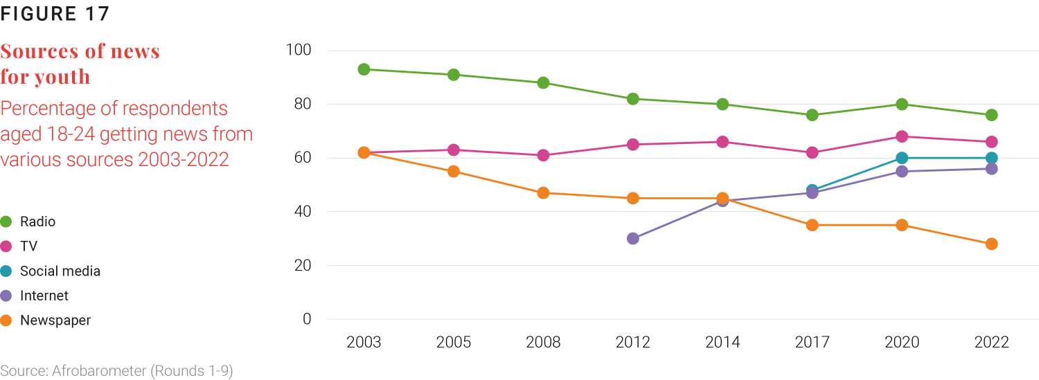What about news and information? Figure 17 shows news consumption by age cohort. While traditional forms of media like radio and newspapers remain popular forms of news consumption, these mediums experienced marked declines in consumption between 2003 and 2022. Conversely, more Africans, and especially African youth, are consuming news from social media and general internet sources, with 60% of youth reporting consuming news from social media as of 2022.