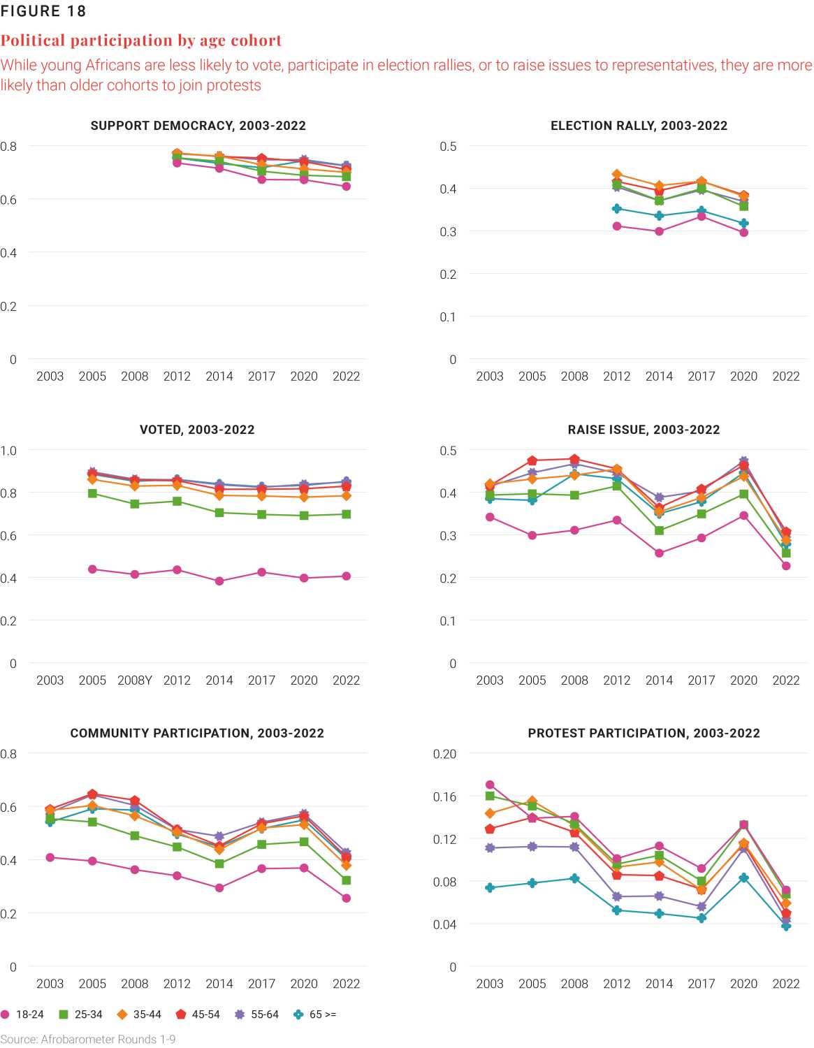 Based on a representative sample of African citizens,8 Figure 18 shows political participation by age cohort across five major participation categories such as voting and protest participation. Notably, African youth (aged 18-24) are much less likely to vote, with just 41% of youth reporting having voted in the previous election compared to 77% of older populations in 2022. Moreover, figures for youth voting have remained low over time.