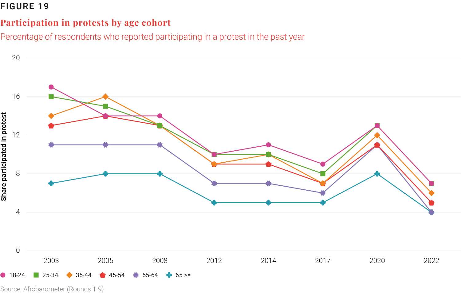Another key observation is that while youth are less likely to be politically engaged across almost all categories, protest participation is an exception—youth are significantly more likely to participate in protests relative to other age cohorts, with 7% of youth reporting protest participation as of 2022 (Figure 19).
