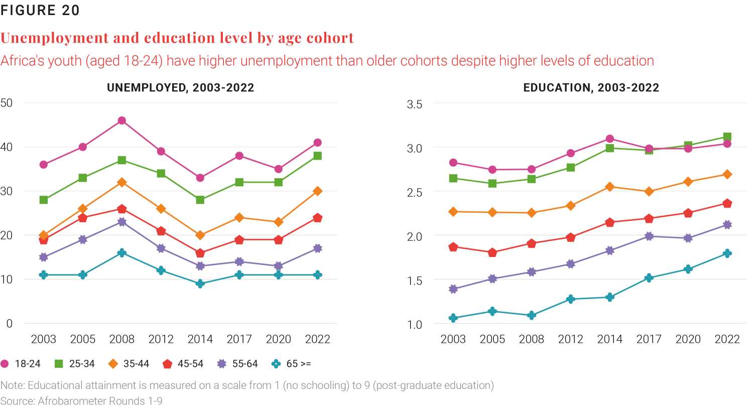 Africa’s youth have some of the highest unemployment rates in the world, despite being among the most educated cohorts in the continent’s history, with 41% of youth reporting being unemployed as of 2022 (Figure 20).