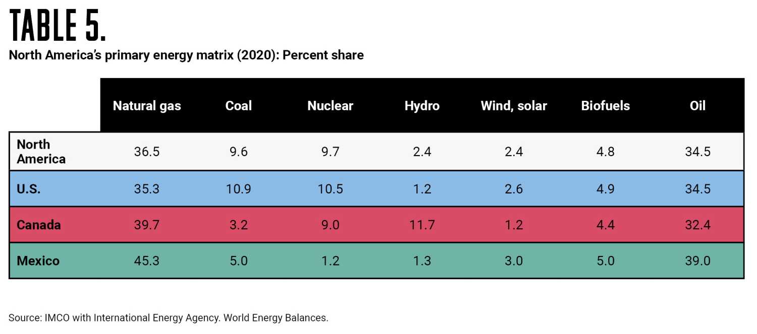 North America must decidedly decommission highly polluting facilities in favor of low-emission technologies. As shown in Table 5, in 2020, natural gas represented 36.5% of the region’s primary energy matrix while clean energies (e.g., nuclear, solar, wind, hydro, and biofuels) accounted for 19.3%. Nonetheless, coal still represented 9.6% and oil, 34.5%. The room for improvement cannot be overstated.