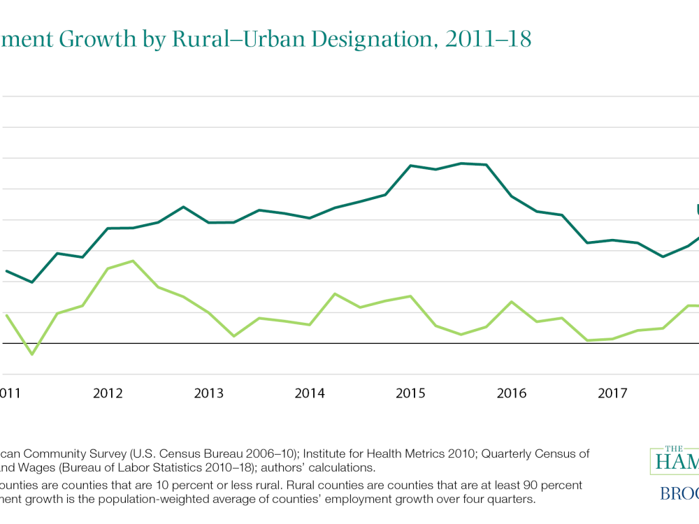 Economic outcomes—in particular household income, poverty, and employment—vary dramatically across counties in the United States. The job growth we see in the headline data every month, though, has been spread relatively evenly across the large urban areas regardless of their vitality. This still leaves large gaps in the levels of vitality and employment rates, but it shows that job growth is not restricted to the booming metropolitan areas on the coasts. On the other hand, rural counties—the majority of which were already struggling—seem to be increasingly left behind with employment barely growing over the last 5 years, lagging growth in urban areas by a substantial margin.