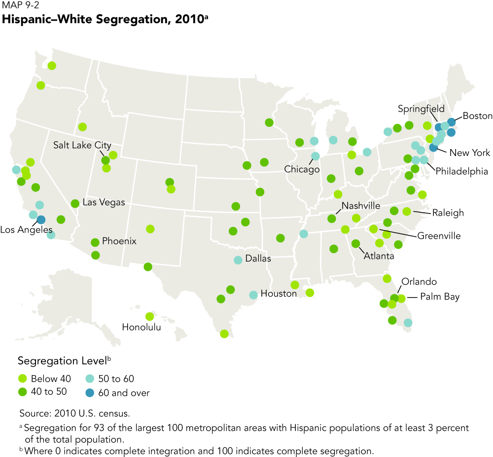 Those areas with lower Hispanic-white segregation are spread over the country, particularly in the South and the interior, areas where Mexicans are a prime nationality and containing small but quickly growing Hispanic populations (e.g. Atlanta, Charlotte, and Salt Lake City). This is significant because as Hispanics continue to disperse away from highly segregated core settlements to these newer destinations, more of them will reside in less segregated neighborhoods.