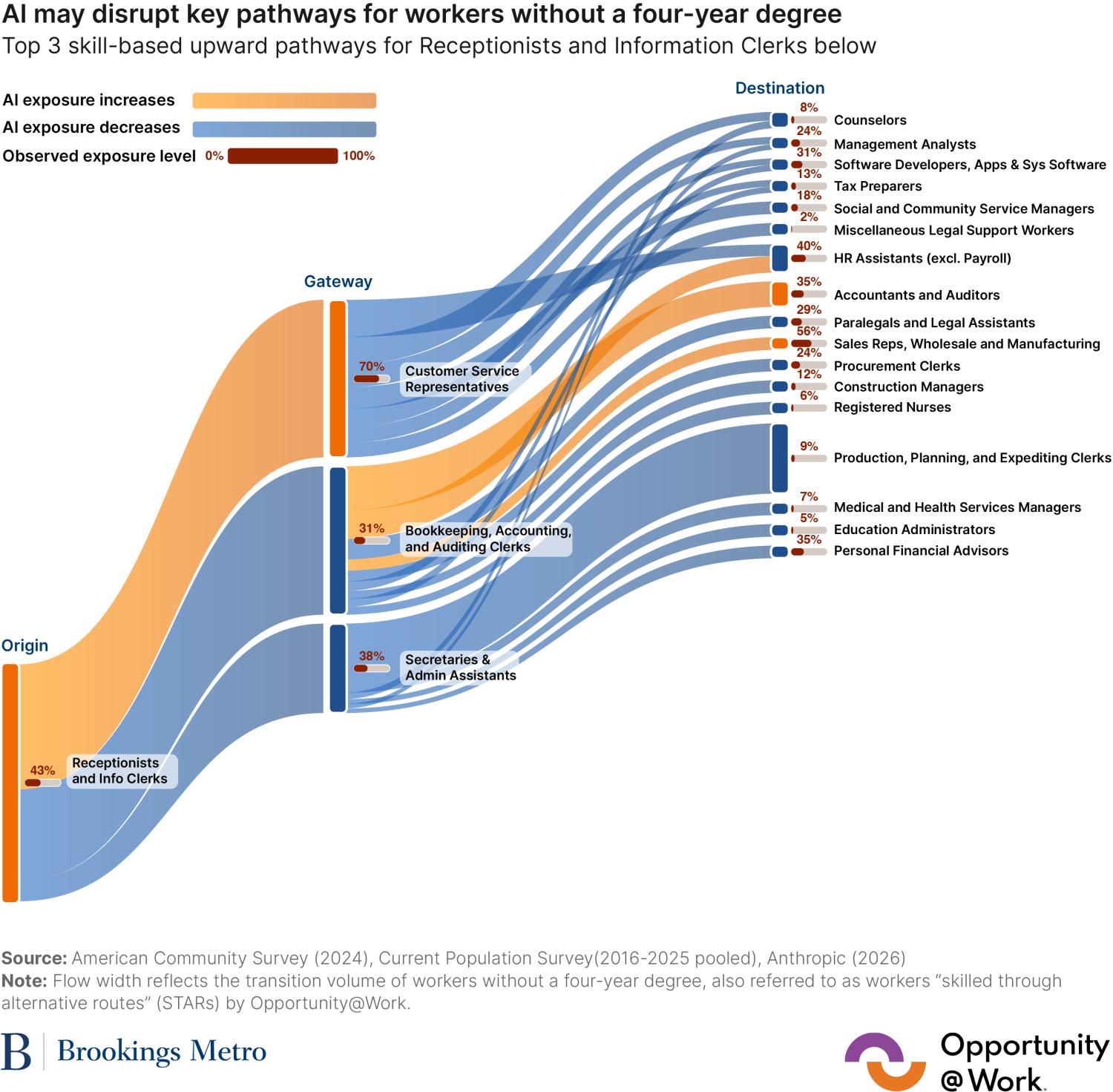- Across Destination occupations, 12.9 million workers—or around one-third of all workers in those occupations—may now be highly exposed to AI, including roles such as sales representatives, accountants and auditors, and financial managers. Erosion of stable employment in these roles would be a serious blow to many workers’ advancement.