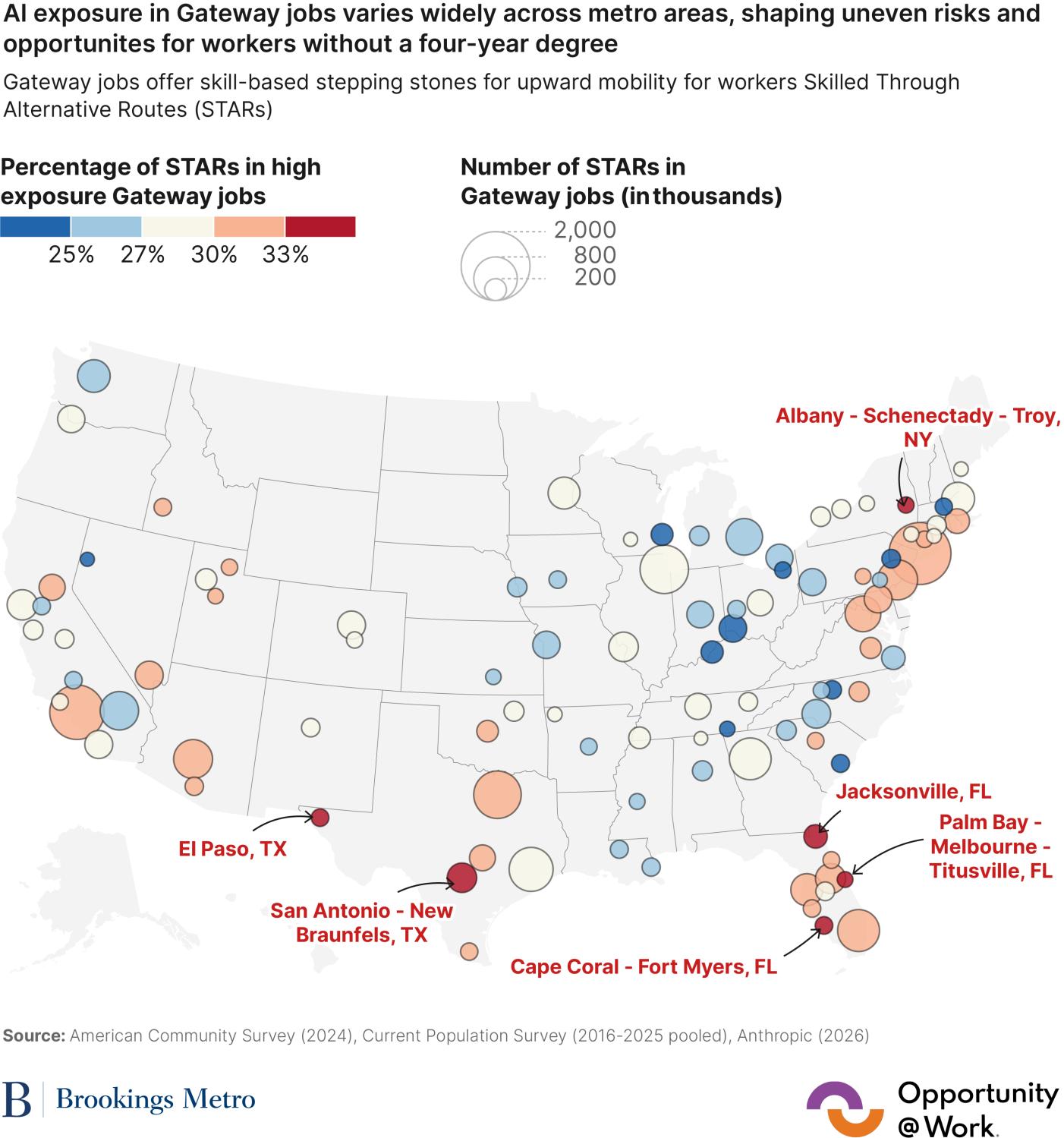 - For example, Northeast metro areas such as Albany, N.Y. (32.8%), Harrisburg, Pa. (32.6%), and Providence, R.I. (30.1%)—all state capitals—show large shares of STARs in highly exposed Gateway occupations, given that pathways there are concentrated in administrative and clerical roles with high AI involvement.