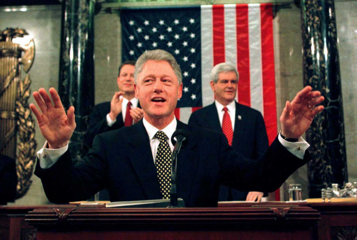 Dean was an unassuming middle-aged man – a 49 year old veteran who had served in Vietnam and then gone to work for the Social Security’s Oklahoma City office where he’d been for the past 22 years. When the bomb went off, he went back into the burning building four times and ended up saving three of his co-workers and bringing out one dead body. After Clinton told his story with the cameras fixed on a quiet Mr. Dean sitting next to Hillary, the entire chamber burst into applause. When it died down Clinton said: