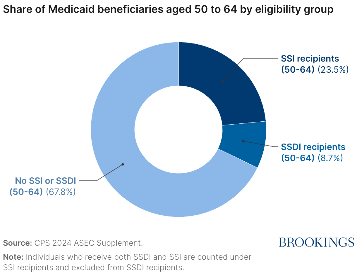 Medicaid enrollees aged 50-64 can be usefully divided into three groups. The first group consists of those receiving Supplemental Security Income (SSI), a program administered by the Social Security Administration that provides monthly benefits to people with limited income and resources with a qualifying disability. Federal law requires states to cover much or all of this group, and, in practice, most states enroll SSI beneficiaries into Medicaid automatically. Approximately a quarter—23.5%—of Medicaid enrollees aged 50 to 64 receive benefits from SSI (compared to 7.6% of Medicaid enrollees aged 19 to 49).