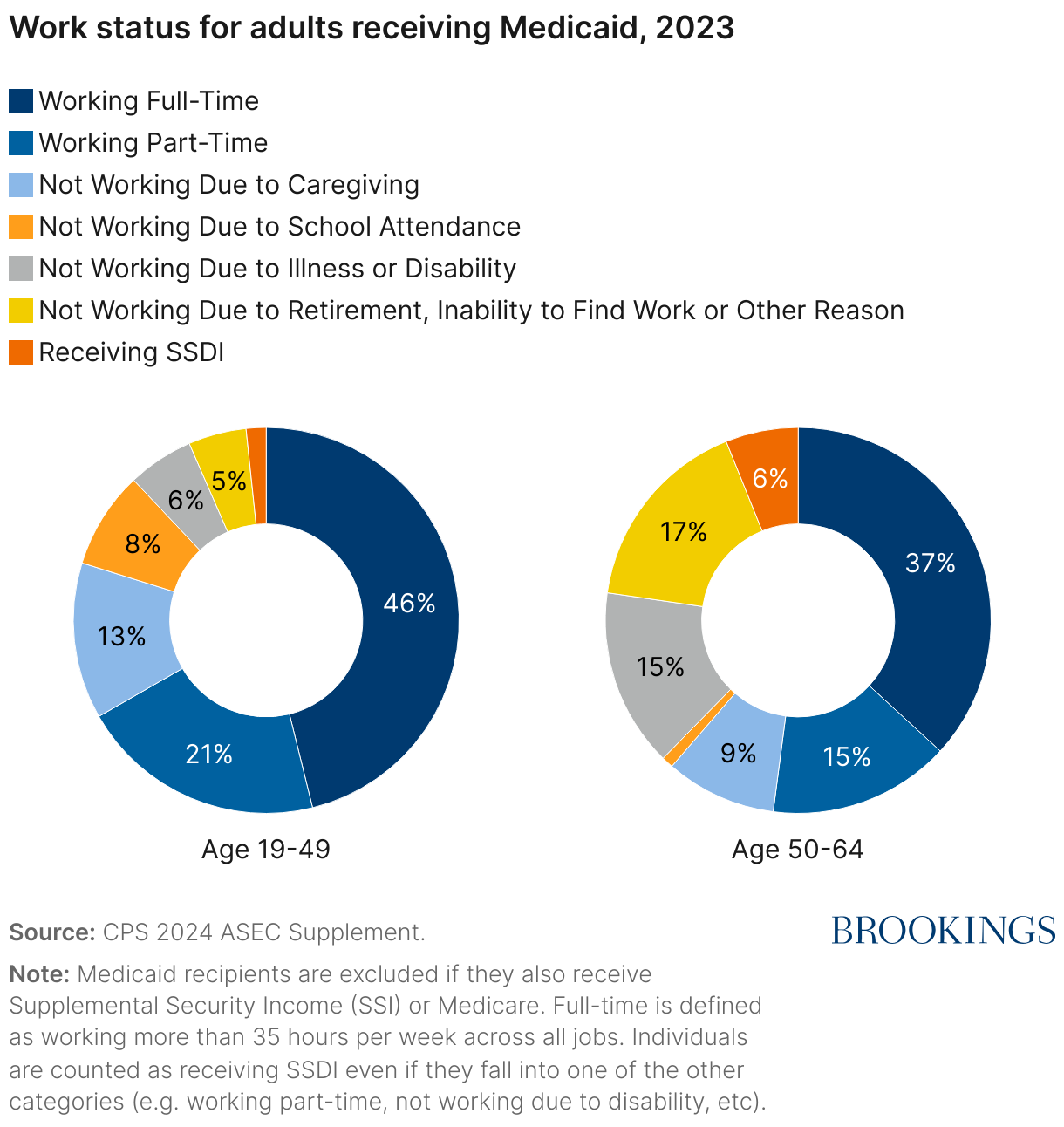 Among Medicaid recipients not receiving SSI or Medicare, 52% of those ages 50 to 64 were employed, compared to 67% of those ages 19 to 49. Within the age 50 to 64 group, 37% worked full time and 15% worked part time, compared to 46% and 21%, respectively, for 19-49 year-olds. The reasons for non-employment varied as well, with the younger group reporting caregiving and school attendance as the most common reasons for not working, while illness or disability was a more common reason among 50-64 year-olds, accounting for almost one in six enrollees in this group potentially subject to work requirements. This is notably much larger than the 6% of the sample receiving SSDI benefits.