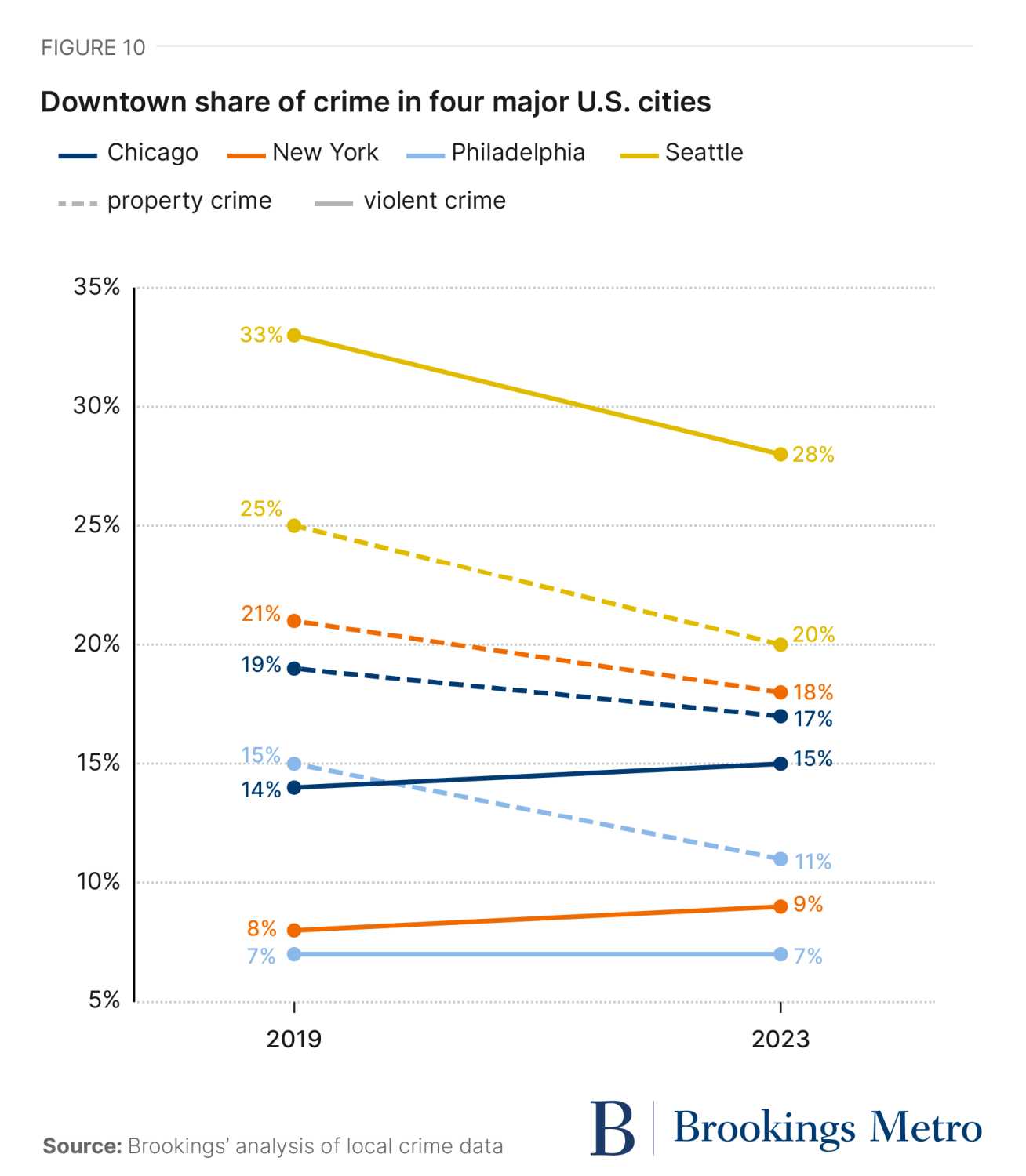 Rather than allowing perceptions alone to drive decisionmaking, local leaders can—and should—respond to rising fears of crime with evidence-based policies that match where, why, and how crime actually occurs within cities. Our analysis found that across cities, downtowns are some of the safest places for residents to live, work, and play. As Figure 10 shows, the share of citywide crime that occurs downtown has declined since the pandemic in some of the nation’s largest cities.