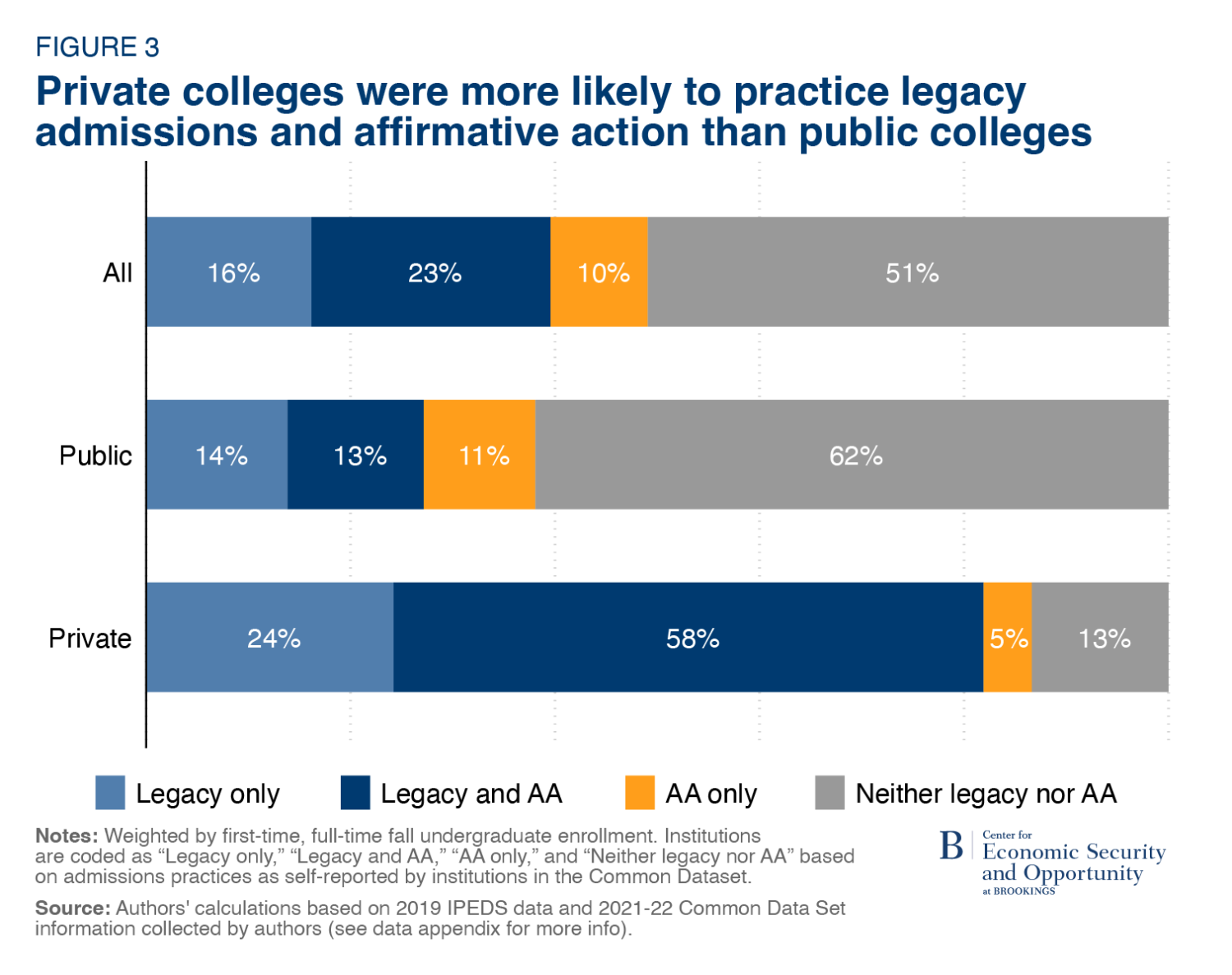 Among public colleges, 14% of enrollment was in colleges that only considered legacy status and 13% were in colleges that considered both legacy status and race. Among private colleges, 24% of enrollment was in colleges that considered only legacy status, while 58% were in colleges that considered both legacy status and race. Across both public and private colleges, legacy admissions were more common than affirmative action.4