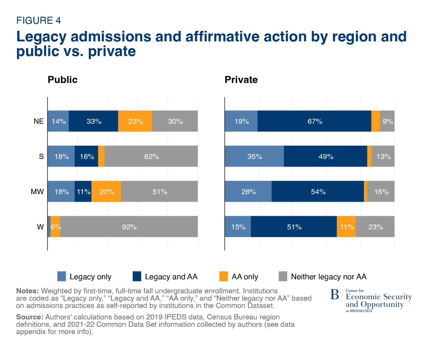 Figure 4 shows the intersection between legacy and race consideration by region (as defined by the Census) and whether a college is public or private. The regions are ordered from highest to lowest share using legacy admissions (the two shades of blue). Legacy admissions were most common in the Northeast (NE) and least common in the West (W), but there is significantly more regional variation among public colleges. Among public colleges, the total percentage attending colleges that considered legacy status ranged from 47% in the Northeast, to 2% in the West. Among private colleges, the percentage ranged from 86% in the Northeast to 66% in the West. Regions with higher rates of legacy admissions generally also had higher rates of colleges practicing both legacy admissions and affirmative action. As already illustrated in figure 3, private colleges were more likely than public colleges to practice legacy admissions in conjunction with affirmative action.5