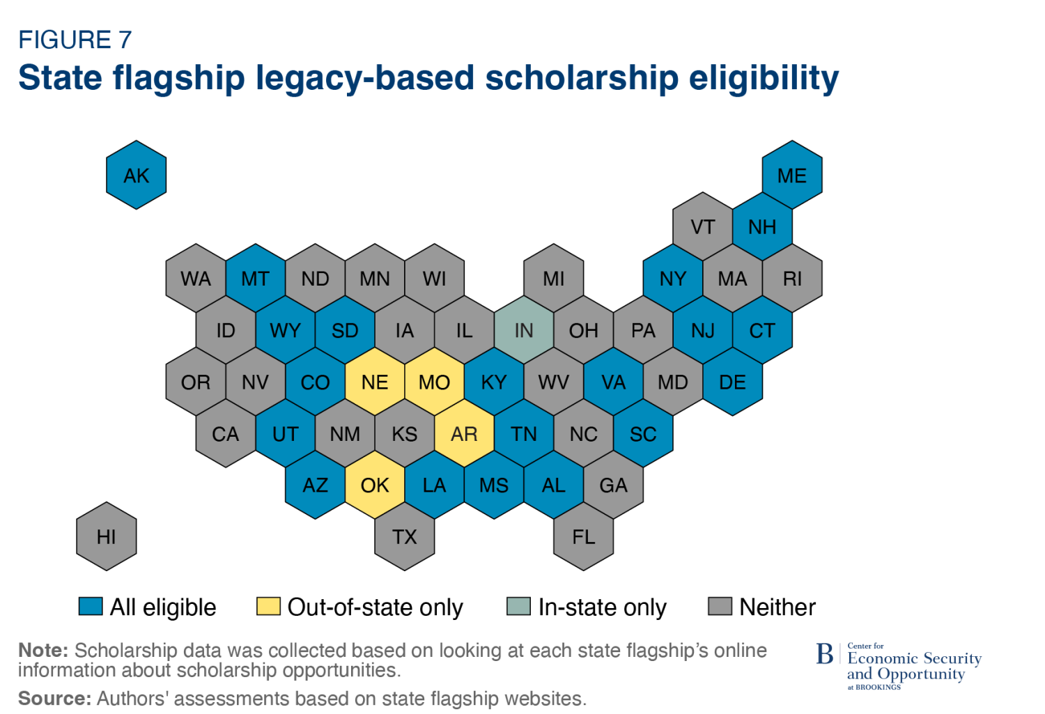During our data collection, we discovered that some colleges offer scholarships for legacy students, which could have similar implications to legacy admissions but is not captured by either dataset on admissions practices. Collecting scholarship information for all colleges is prohibitively time-consuming, but we searched the websites of each state flagship for information about whether they have scholarships that are only available to legacy students (and whether they are for in-state, out-of-state students, or both). We also confirmed (via the admissions website, public statements, or by calling the college) the current status of legacy admissions at the state flagships, which we report on separately below.