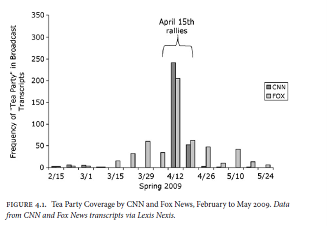 As sociologist Theda Skocpol and I wrote in our first article on the Tea Party movement, “conservative media have played a crucial role in forging the shared beliefs and the collective identity around which Tea Partiers have united.” This kind of coverage was both qualitatively and quantitatively different from traditional media attention. As you can see in the figure below, drawn from our 2012 book, CNN coverage matched Fox News during protest events. But Fox News’ coverage preceded the protests and continued thereafter.