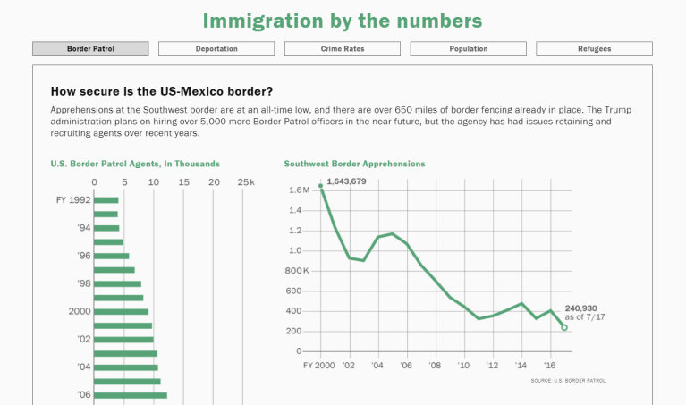 Casting immigrants as violent criminals, refugees as terrorists, and the border as unsecured, President Trump’s rhetoric on immigration has painted a grim picture. The Center for Effective Public Management has assembled the following key statistics on immigration to examine his claims and his policies.