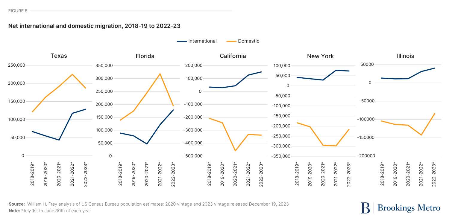 Another demographic development suggested by these estimates is the softening of the sharp domestic migration patterns away from highly urbanized states outside the South, and toward southern “migration magnet” states, especially Florida and Texas. While those patterns reflected a pandemic-related “urban doom loop,” the 2021-2022 population estimates for urban areas and cities as well as other research suggests a return to pre-pandemic urban migration and growth trends. The next round of Census Bureau estimates for these areas—to be released later this year—should shed more light on this.